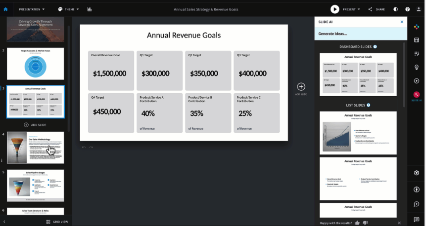 - 대표 기능: Create with AI, Smart Slides, Team Theme, shared slides, analytics