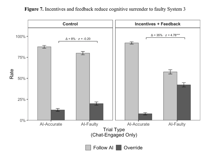 - 오답 AI가 있는 문제 정확도: 통제 30.7%, 인센티브+피드백 45.5%