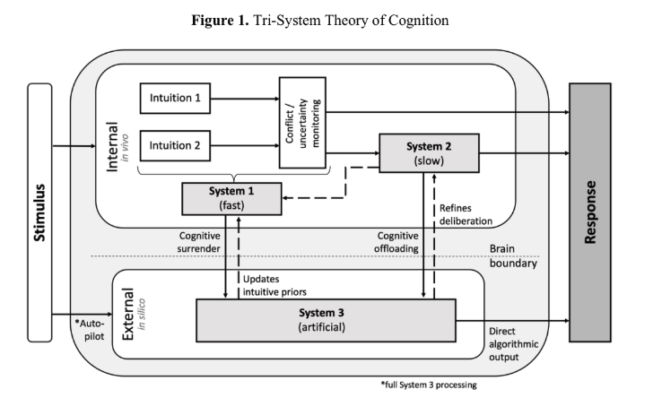 이 논문의 출발점은 기존의 이중과정 이론만으로는 오늘의 판단 환경을 충분히 설명하기 어렵다는 문제의식이다. 전통적으로 인간의 사고는 "빠르고 직관적인 처리"와 "느리고 숙고적인 처리"로 구분돼 왔다. 그러나 생성형 AI가 일상적인 판단 보조 도구로 들어온 이후에는, 이 두 체계만으로는 실제 의사결정 과정을 설명하기 어렵다는 것이 저자들의 주장이다.