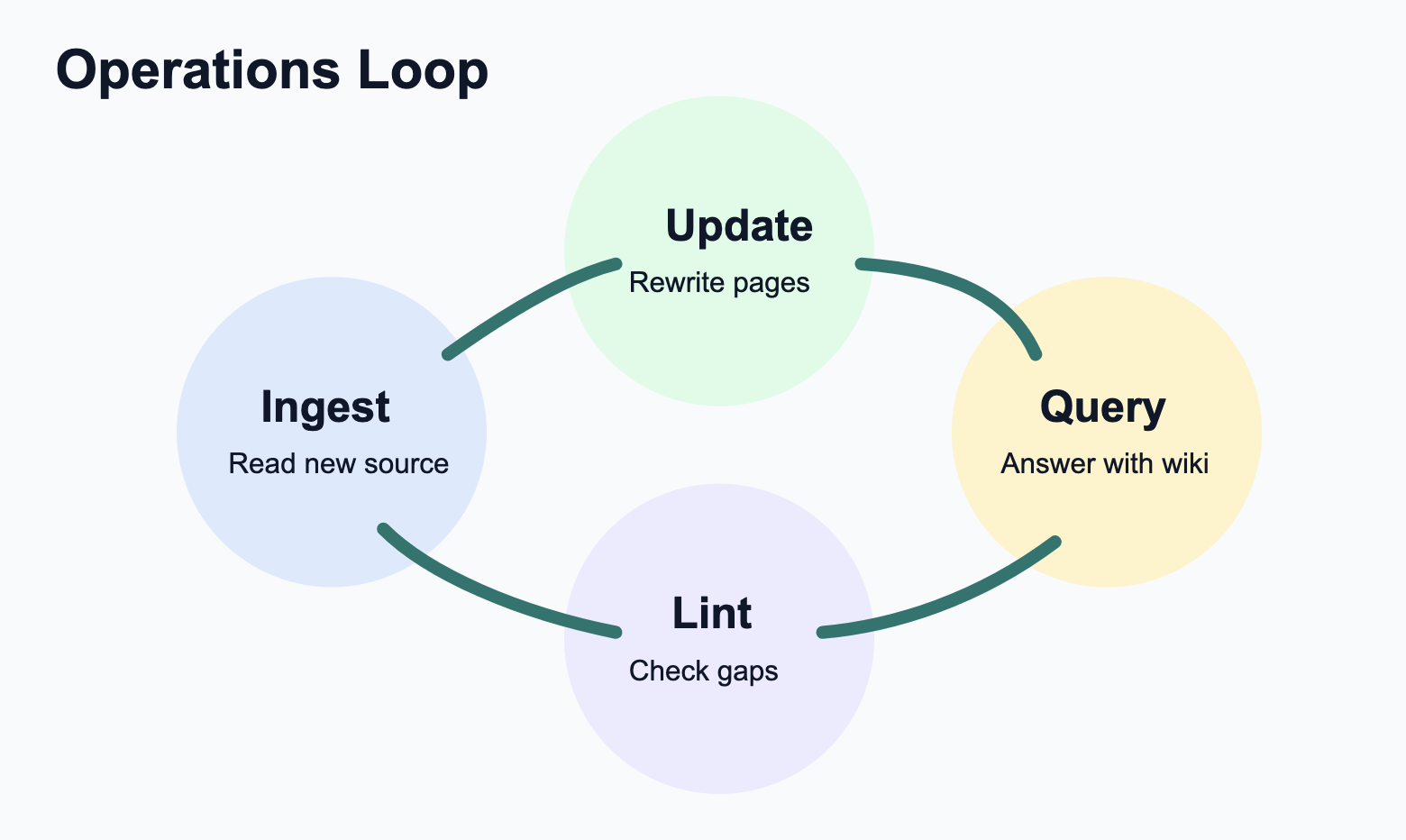 - 소스 투입: 문서 추가, 요약 생성, 관련 페이지 수정, 로그 기록
