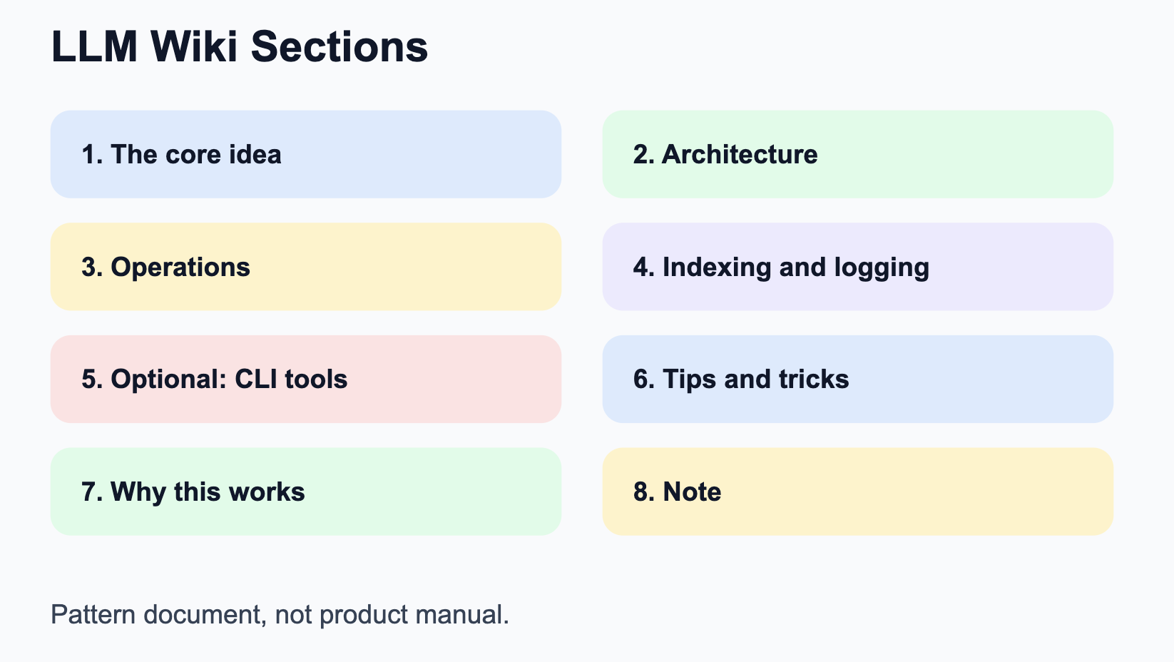 안드레이 카파시의 LLM Wiki gist는 새로운 제품 발표라기보다, LLM 시대에 지식을 어떻게 쌓을지에 대한 운영 패턴 제안에 가깝다. 파일을 올리고 질문할 때마다 다시 찾는 방식에서 한 걸음 나아가, LLM이 위키를 계속 갱신하며 사람과 문서 사이의 중간 기억층을 만든다는 발상이다.