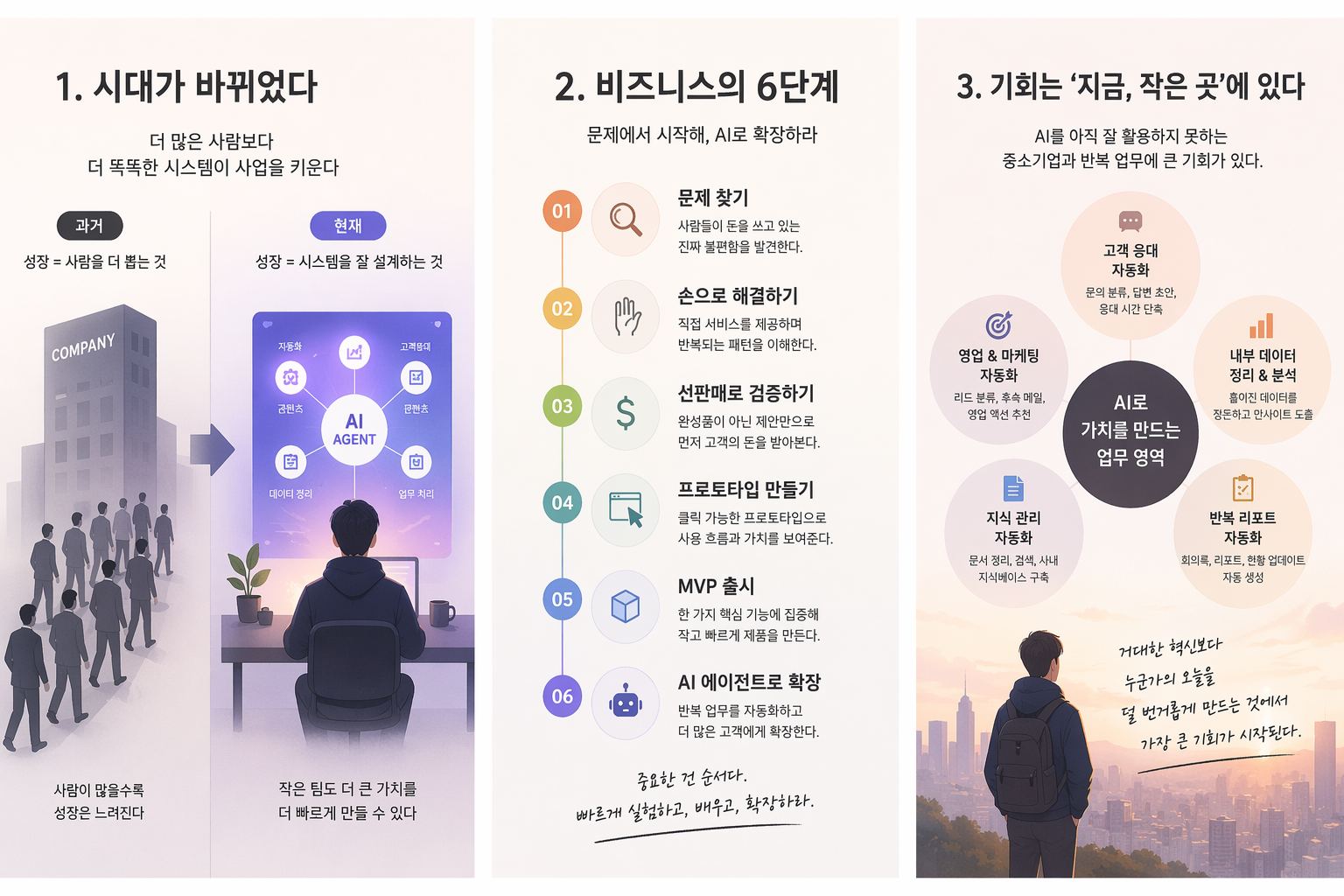 고객의 일을 직접 도와주고, 실제로 어떤 요청이 반복되는지 보고, 어디에서 병목이 생기는지 체감하라는 것이다. 그 과정을 통해 “자동화할 만한 패턴”이 보이기 시작한다.