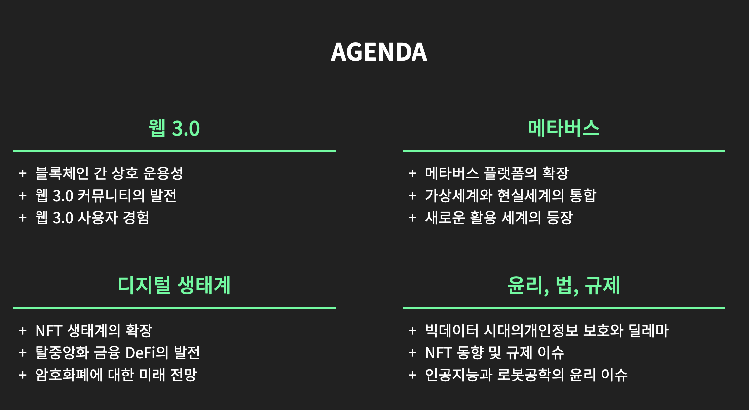 이번 6월 마지막주 목요일, 금요일에 아시아 최대 웹 3.0 X 메타버스 콘퍼런스인 2023 메타콘이 예정되어 있습니다. 웹 3.0에서는 많은 개발자들이 궁금해할 블록체인 간 상호 운용성뿐만 아니라, 커뮤니티와 사용자 경험이 공유될 예정입니다. 그리고 메인 주제인 메타버스에서는 플랫폼 확장과 가상세계 통합으로 나타날 새로운 활용 세계 등장에 대해 인사이트를 얻을 수 있습니다.