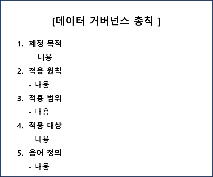 회사에서 데이터 거버넌스 가이드라인을 제정하기 위해서는 전체를 포괄하는 규칙이 필요합니다. 데이터 거버넌스 가이드라인 제정목적과 적용원칙, 적용범위, 적용대상 등을 우선 지정하고, 혼돈을 일으키지 않도록 용어설명에 대한 내용 작성하는 것을 추천합니다. 총칙에 대한 부분이 완성되었다면, 거버넌스의 일반적인 업무에 대해 정의하고 상세 체계나 세부 기준을 더하는 것이 가이드라인의 완성도를 높여줍니다.
